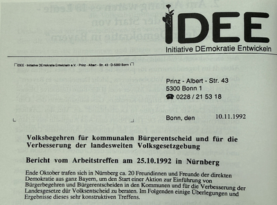 Alles begann am 25. Oktober 1992 mit 18 Engagierten in Nürnberg. Aus diesem Treffen entwickelte sich die Initiative, die am 3. April 1993 offiziell als Verein „Mehr Demokratie in Bayern“ gegründet wurde – Vorläufer des heutigen Fachverbands Mehr Demokratie. Danach wurden Gesetzentwürfe erarbeitet, Aktionskreise im ganzen Freistaat aufgebaut und sogar der Omnibus für Direkte Demokratie war wochenlang in Bayern unterwegs. Der Einsatz trug: Beim Volksbegehren vom 6. bis 19. Februar 1995 trugen sich knapp 1,2 Millionen Menschen ein, also 13,7 Prozent der Wahlberechtigten im Freistaat.